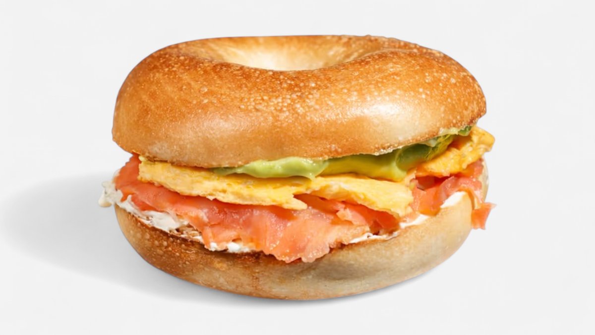 Ingredients: Sourdough Bun , Bagel or Wrap topped with herb cream cheese spread, two scrambled eggs , smoked salmon , smashed avocado and fresh parsley and tomatoes .