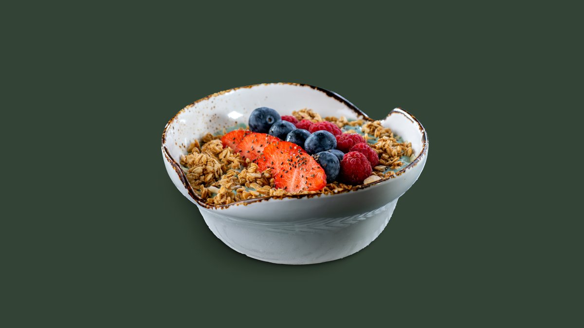 Low fat yogurt with spirulina and chia seeds, seasonal forest fruits, walnuts, honey and granola