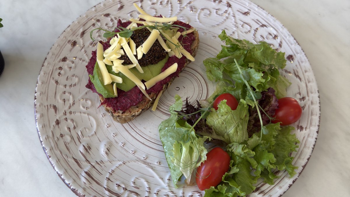 Vegan open sandwich made with homemade plant based caviar(chia, nori and soy sauce) homemade beetroot spread (garlic,kidney red beans and walnuts) fresh avocado and vegan cheese!Comes with green salad!