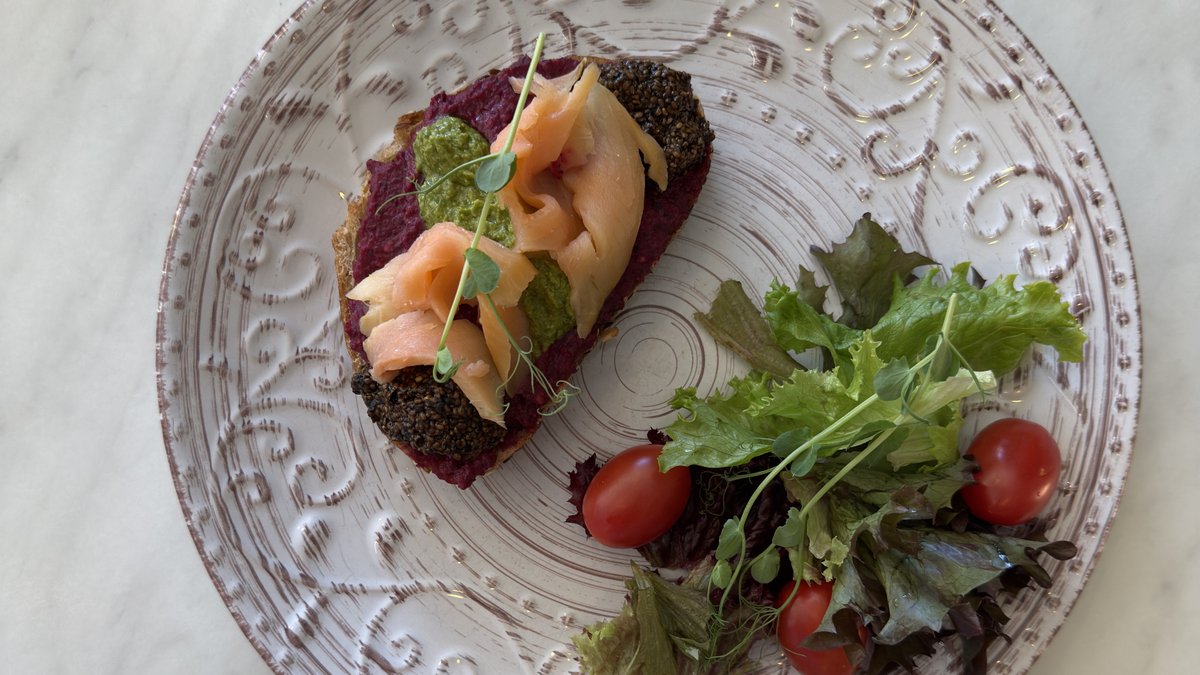 Open sandwich made on whole grain slice of bread topped with homemade beetroot spread made of (beetroot, kidney red beans and garlic) homemade plant based caviar made of (nori, chia and soy sauce) homemade parsley pesto and smoked salmon. Comes with the green salad