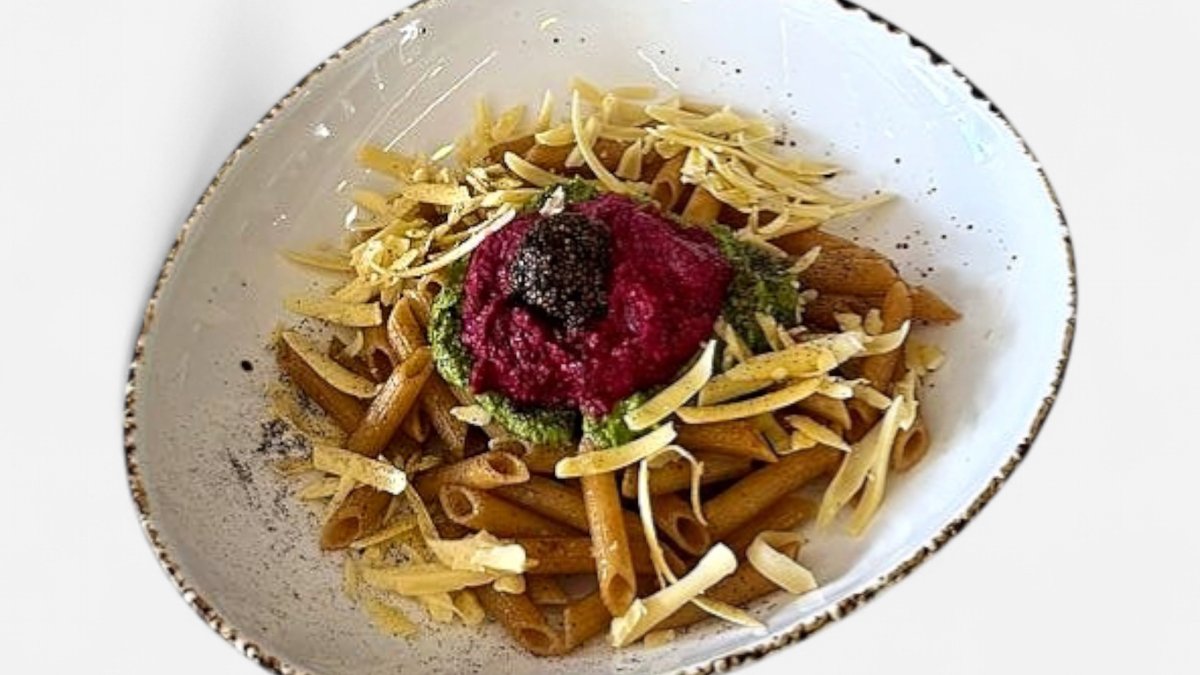 Whole grain pasta topped with homemade plant base caviar made of (chia, nori and soy sauce) and homemade beetroot spread made of(beetroot, garlic,walnuts,kidney beans) and vegan cheese