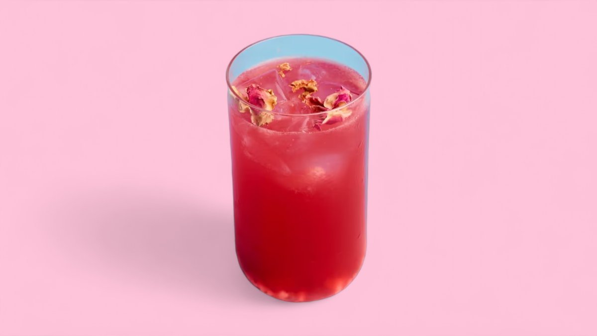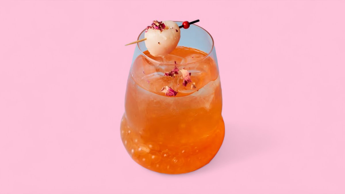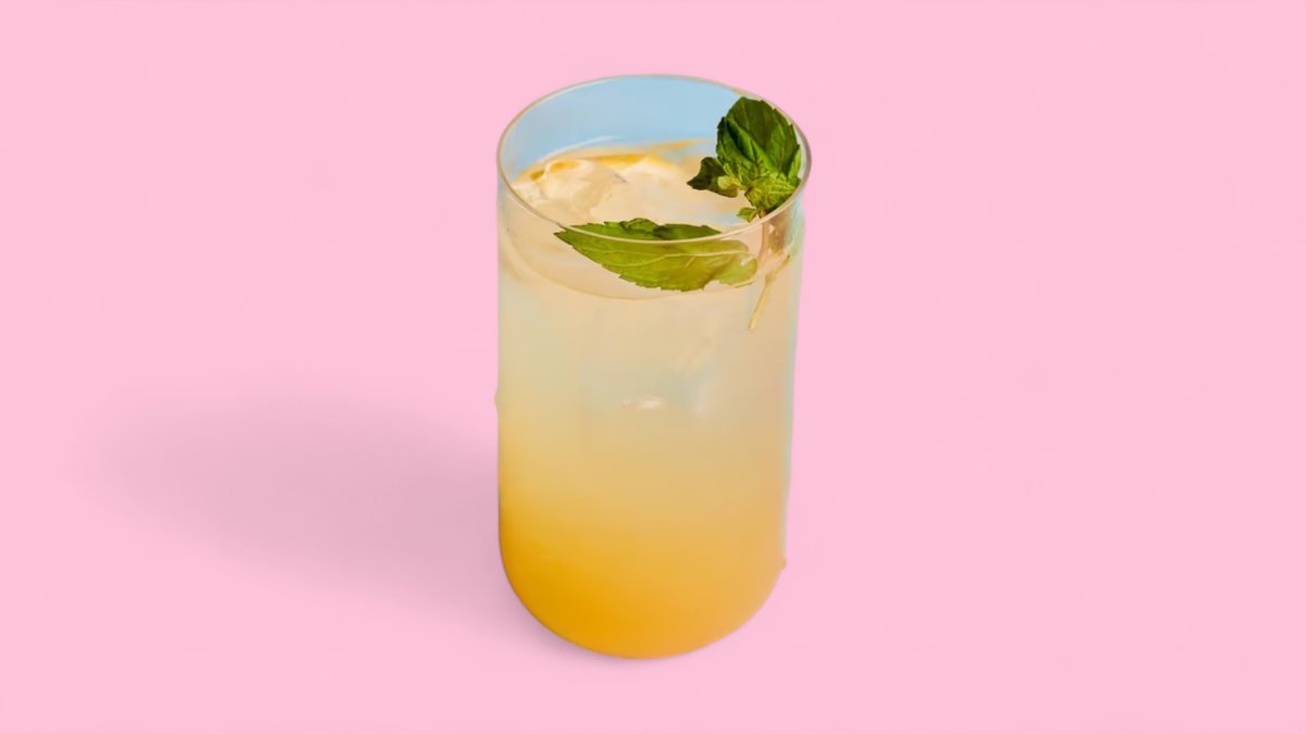 A delicious soft drink made by blending a sparkling water and juice base with a fruit syrup and melon popping boba.