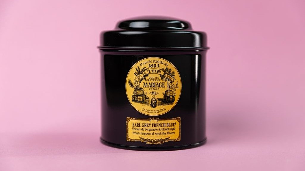 Black tea, velvety bergamot & royal blue flowers Black classical sealed canister containing 100 g of tea and presented in a gift box