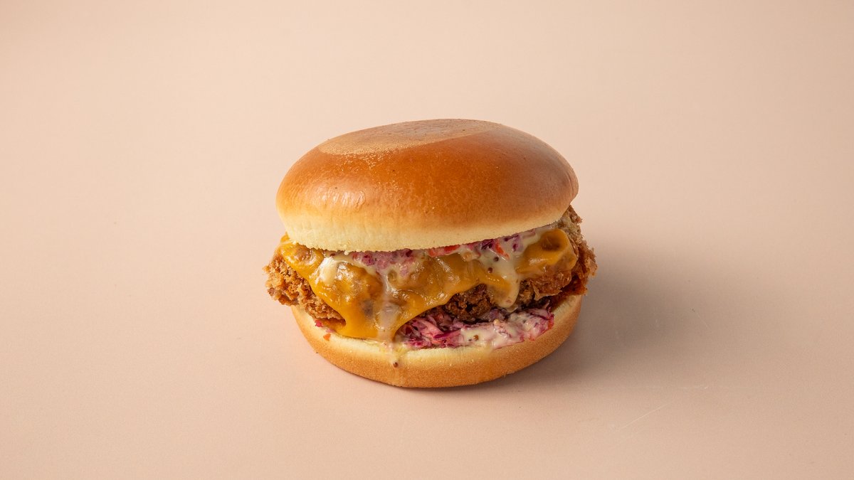 Crispy fried chicken, double cheddar cheese, coleslaw, pickles and honey mustard sauce in a brioche bun