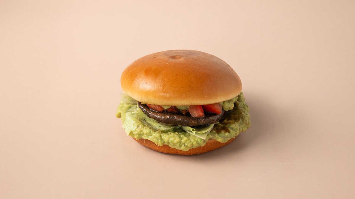 Marinated Portobello mushroom with mashed avocado, iceberg and marinated tomato salad, in a brioche bun