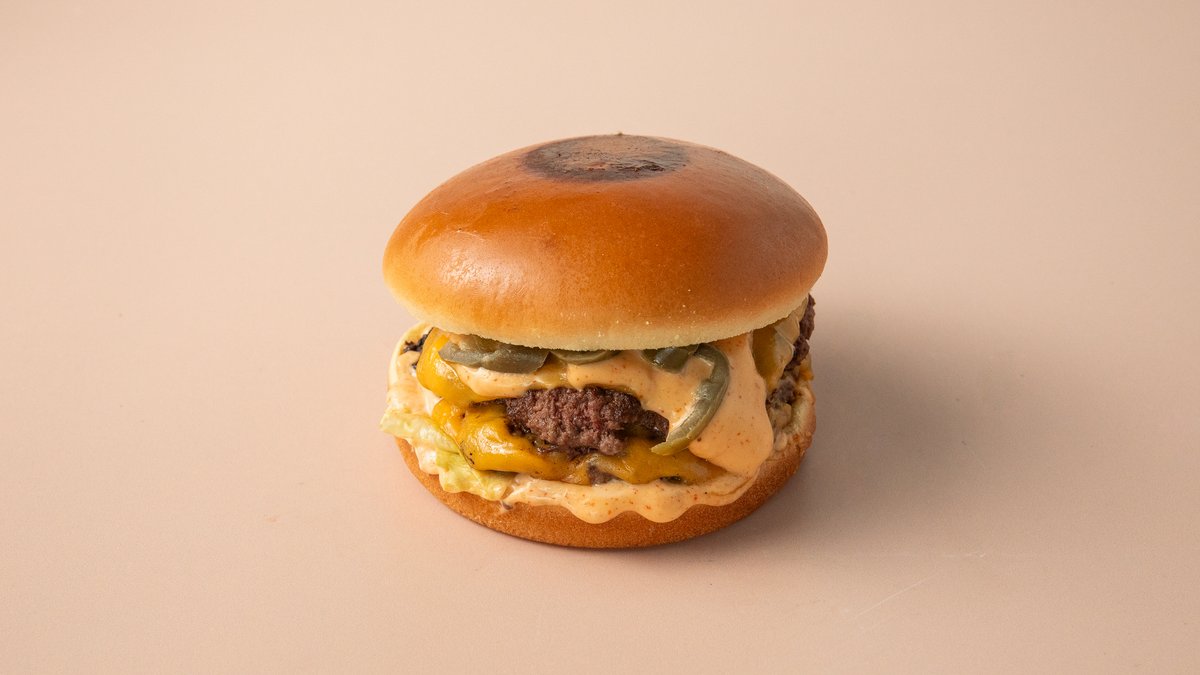 2x100gr smash 100% beef patties, double cheddar cheese, jalapeños, iceberg, pickles and spicy sriracha mayo sauce in a brioche bun