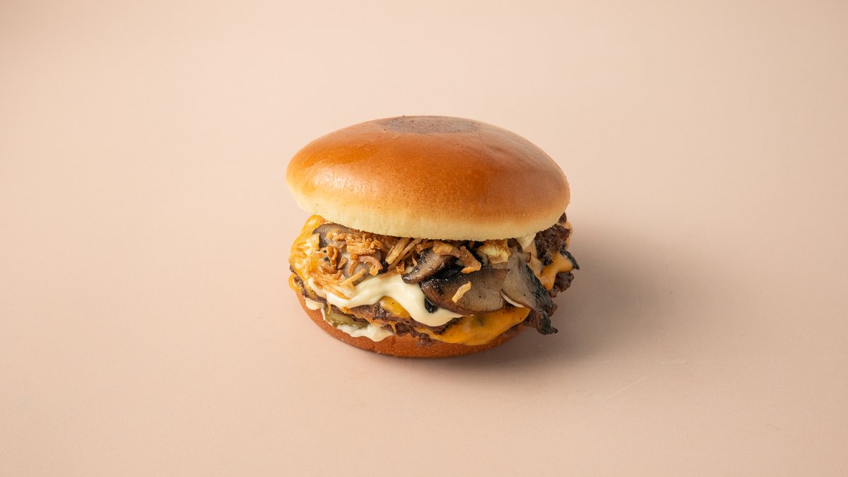 2x100gr smash 100% beef patties, double cheddar cheese, sauteed mushrooms, crispy onion flakes,iceberg, pickles and truffle mayo sauce in a brioche bun