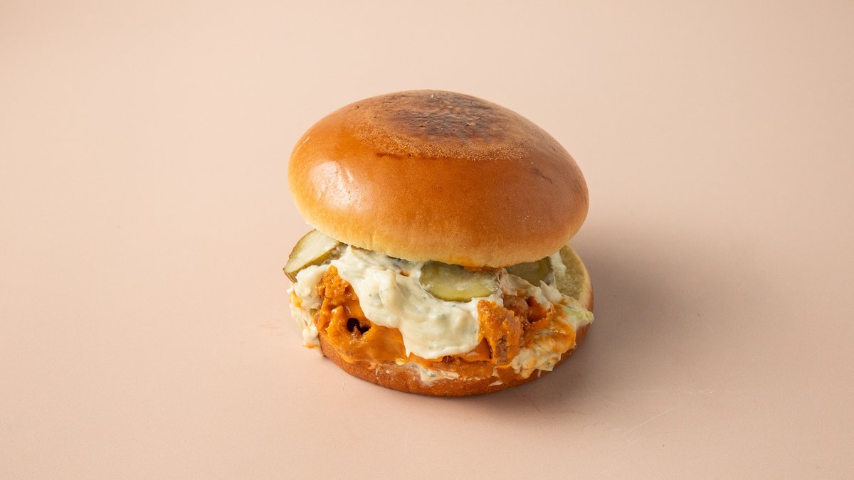 Crispy fried marinated chicken in spicy buffalo sauce, blue cheese mayo, pickles and iceberg in a brioche bun