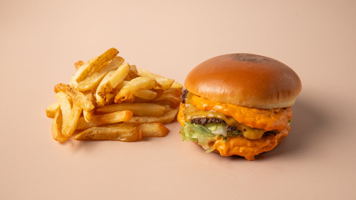 2x100gr smash 100% beef patties, double cheddar cheese, jalapeños, iceberg, pickles and spicy sriracha mayo sauce in a brioche bun. Served with crispy fries.
