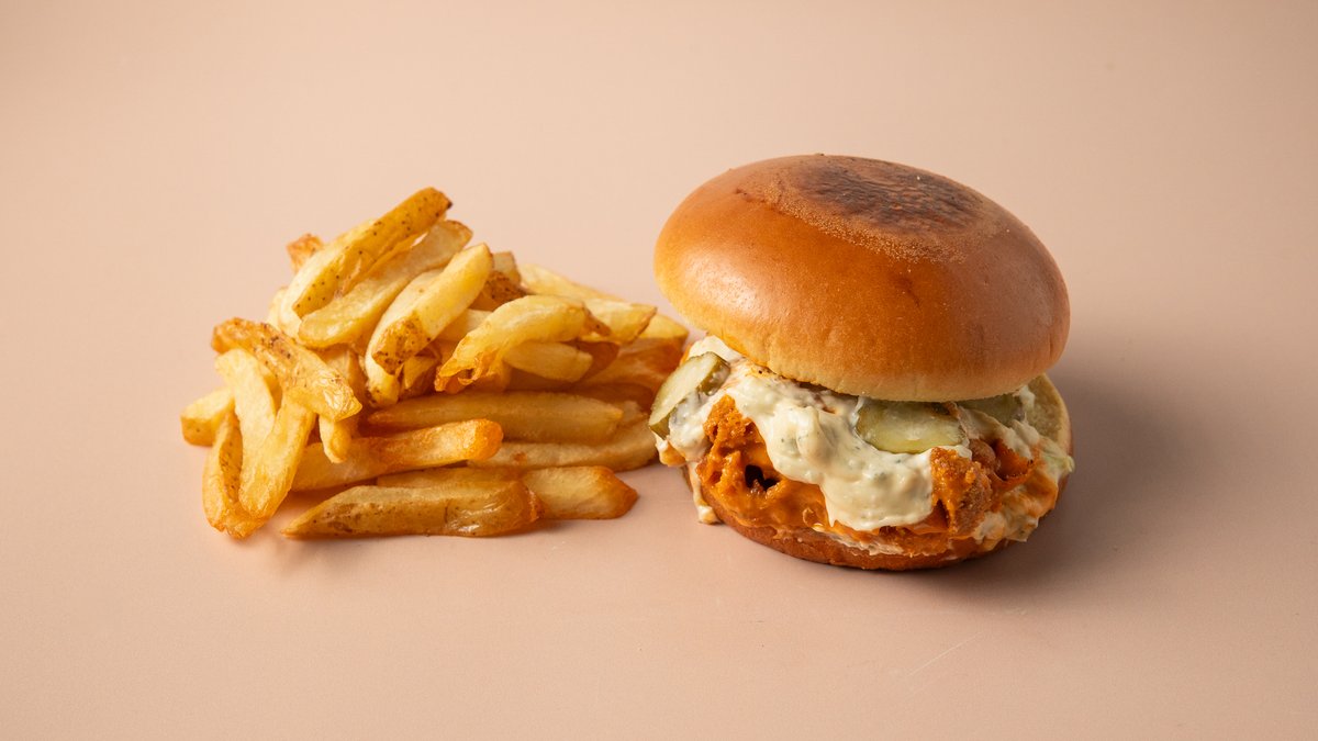 Crispy fried marinated chicken in spicy buffalo sauce, blue cheese mayo, pickles and iceberg in a brioche bun. Served with crispy fries.