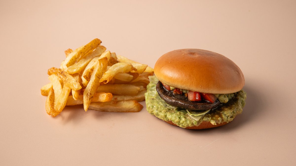 Marinated Portobello mushroom with avocado lemon cream, iceberg and marinated tomato salad, in a brioche bun. Served with crispy fries
