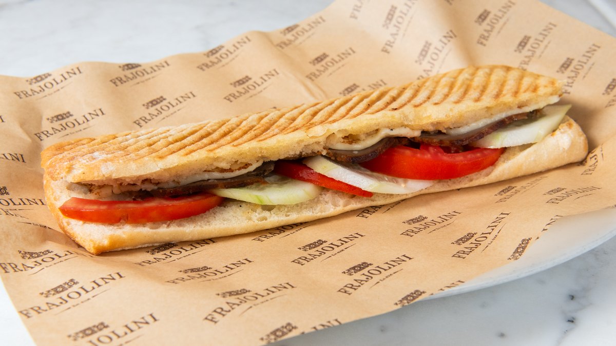 Chiabatta bread with chicken breast, anari, fresh mushrooms, tomato, homemade tomato sauce and olive paste
