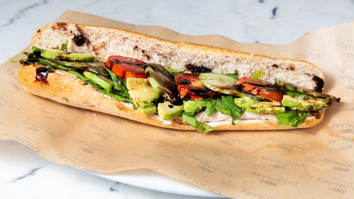 Whole grain baguette with arugula, roast turkey, avocado, tomato, cucumber, cream cheese and balsamic glaze
