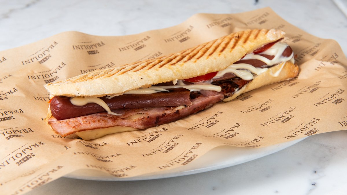 Ciabatta bread with lountza bacon, sausage, edam cheese, halloumi, tomato, cucumber and mayonnaise