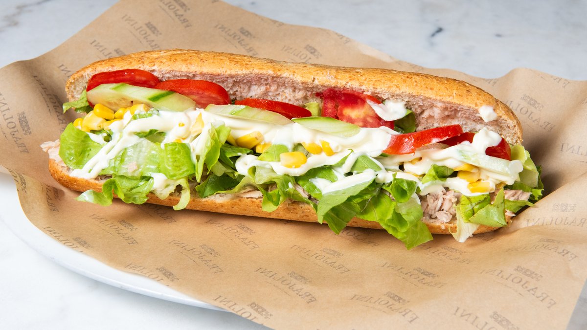 Whole grain baguette with lettuce, tuna, corn, tomato, cucumber and mayonnaise