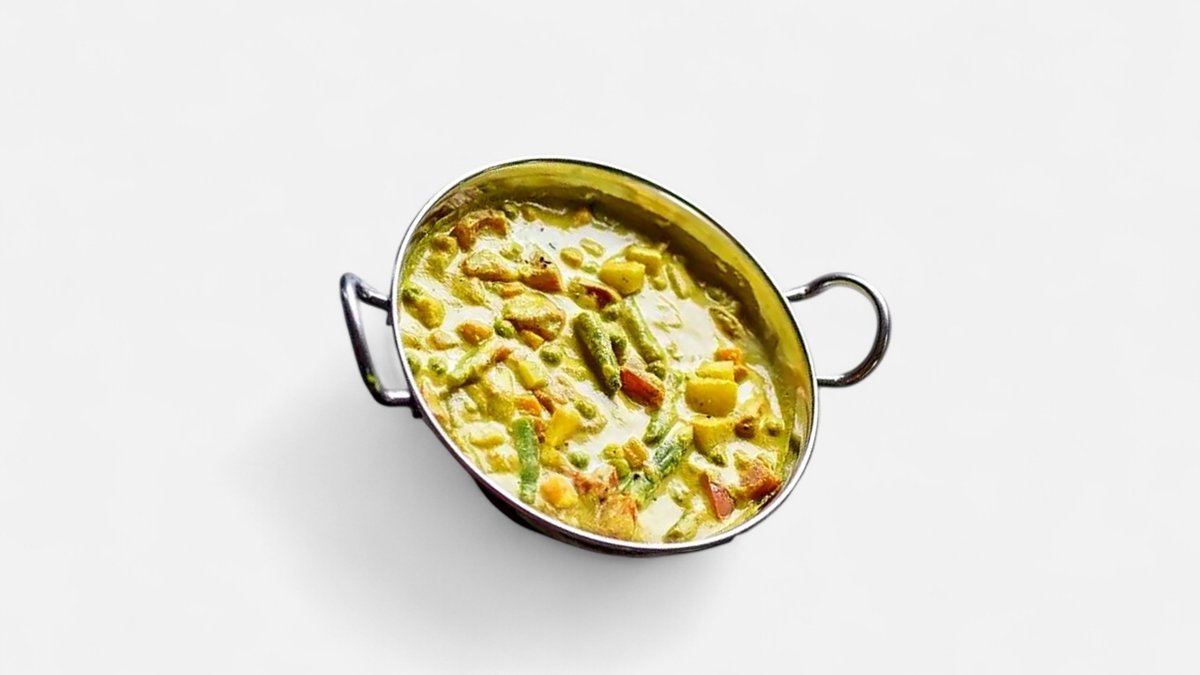 A delightful Mughlai curry made with nine different vegetables and fruits in a creamy sauce