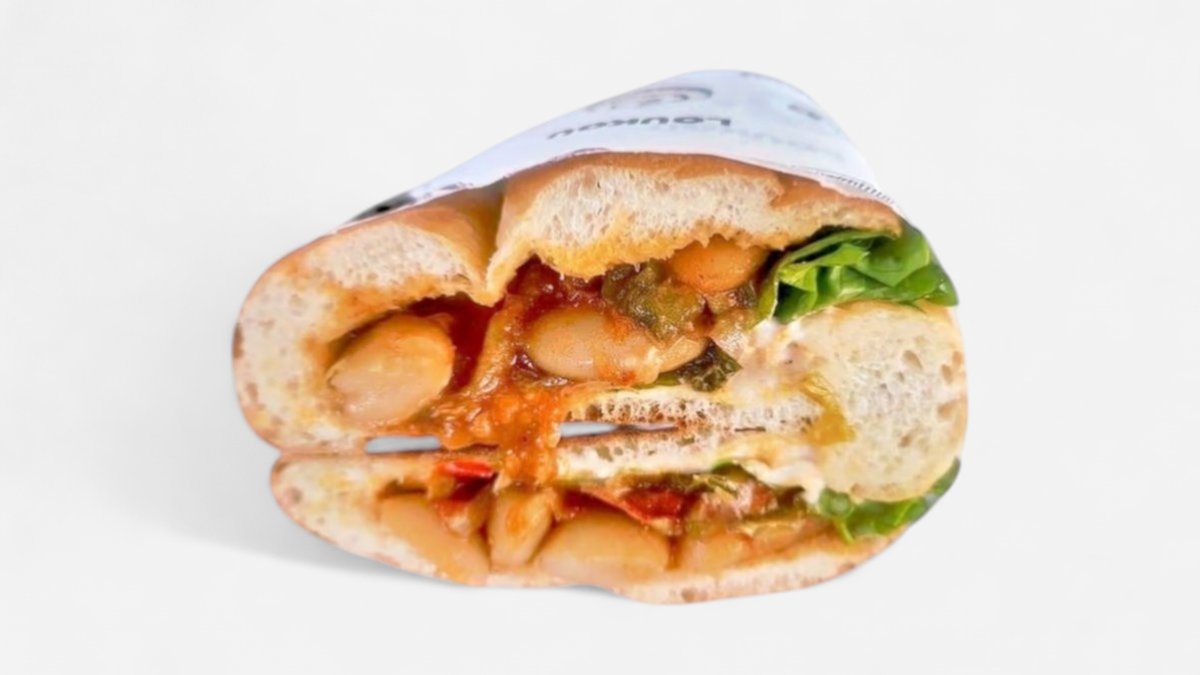 Ciabatta with fresh lettuce, squid , in sun-dried tomato pesto, lime and pistachios