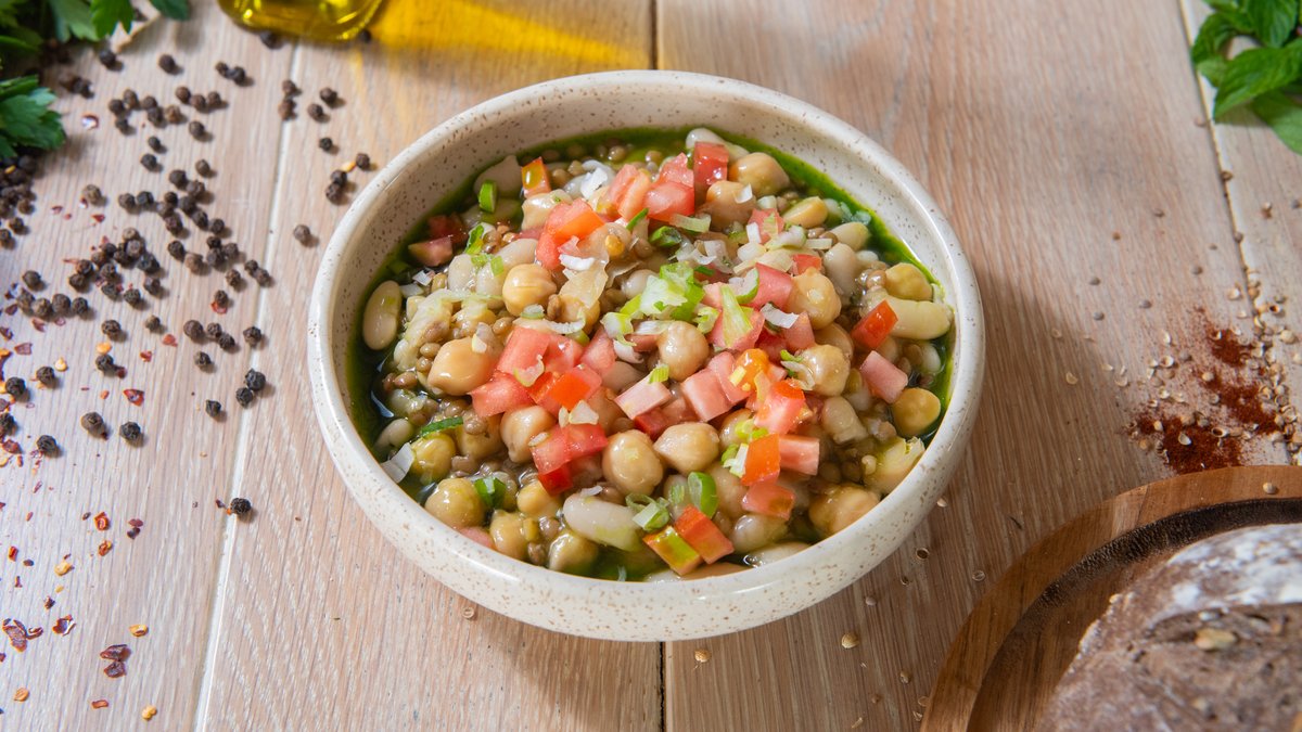Ρεβύθια, άσπρα φασόλια, φακές, άνηθο, φρέσκο κρεμμύδι, φρέσκια ντομάτα, λεμόνι και έξτρα παρθένο ελαιόλαδο