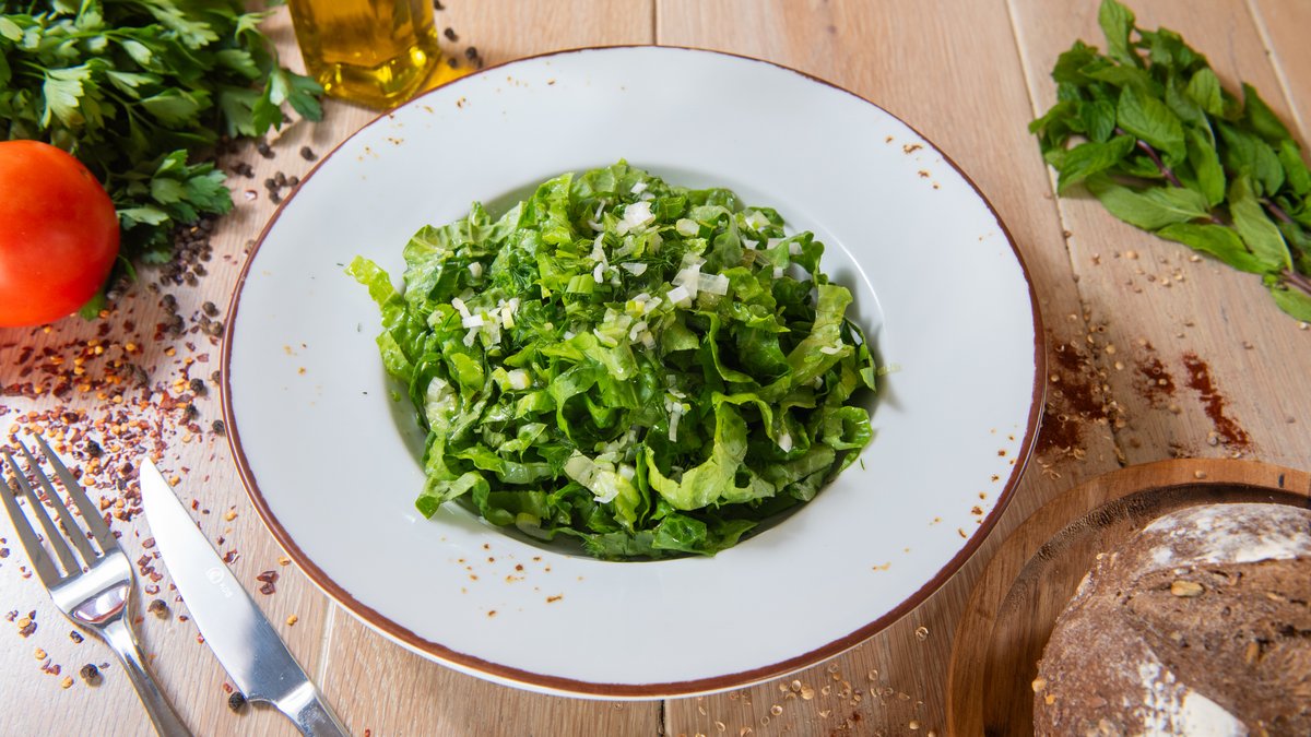 Ψιλοκομμένο μαρούλι, αγγούρι, άνηθο, φρέσκο κρεμμύδι, τριωνέλα και σάλτσα απο μηλόξυδο