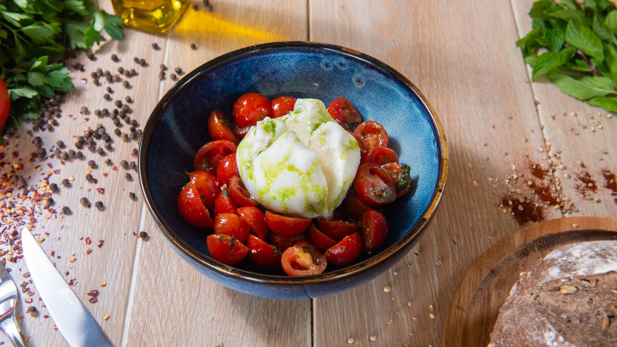 Παξιμάδι χαρουπιού, μπουράτα και πέστο βασιλικού