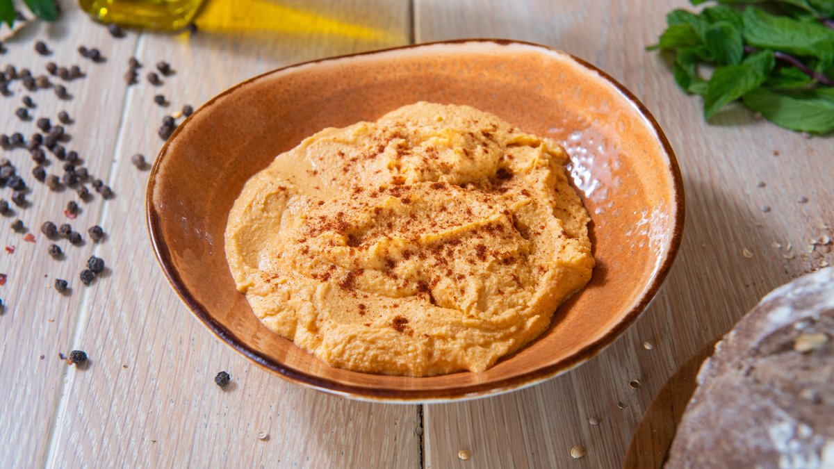 Ρεβύθια, ταχίνι, σκόρδο, έξτρα παρθένο ελαιόλαδο και πιπεριές φλωρίνης