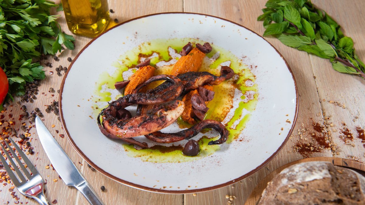 Πουρές πιπεριάς φλωρίνης και λιαστής ντομάτας, ελιές καλαμών, λάδι και πράσο