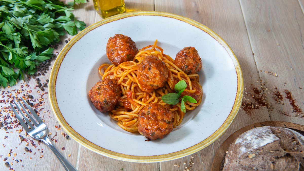 Φρέσκο σπαγγέτι με κόκκινη σάλτσα & κεφτεδάκια κοτόπουλο