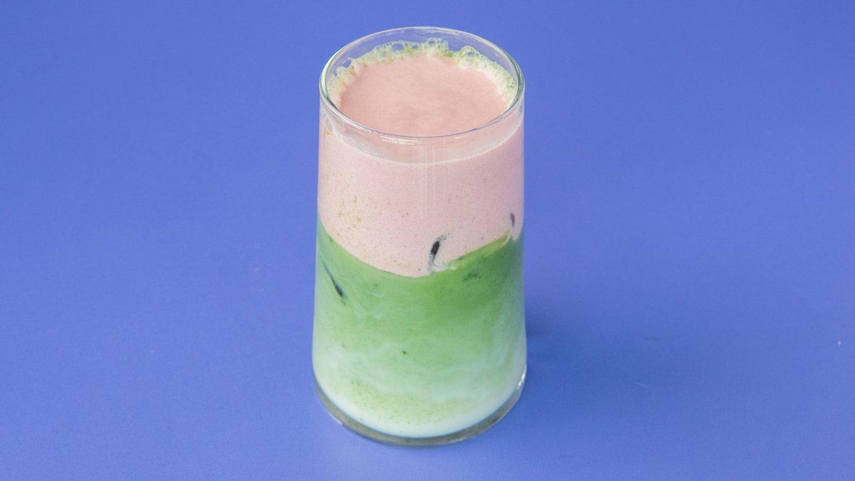 iced matcha latte with strawberry foam