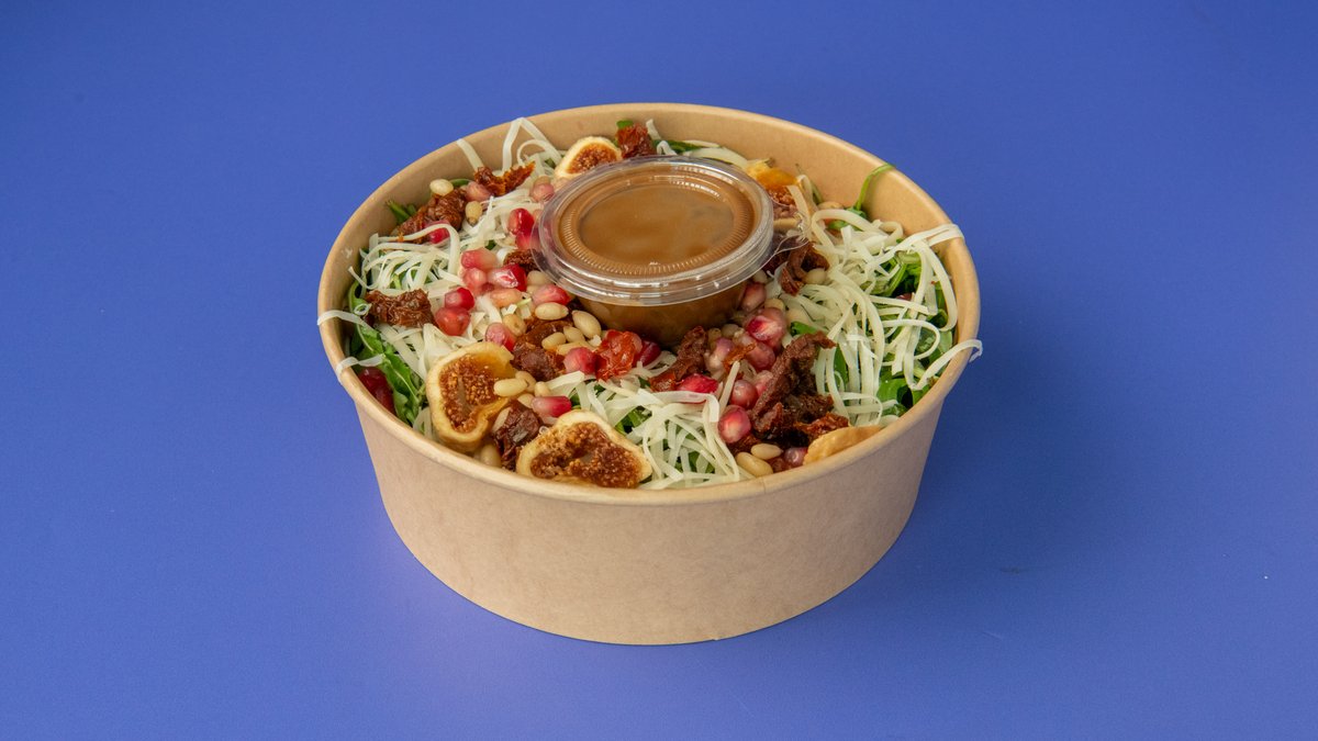 Rocket leaves, parmesan cheese, dried figs, pomegranate, sun-dried tomatoes, honey, balsamic vinegar, olive oil.