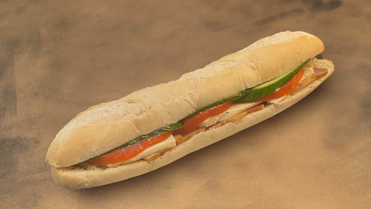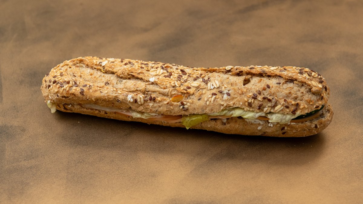 Μπαγκέτα (βρώμης, Λιναρόσπορος, Ηλιόσποροι), καπνιστή γαλοπούλα, τυρί κρέμα, αγγουράκι, μαρούλι