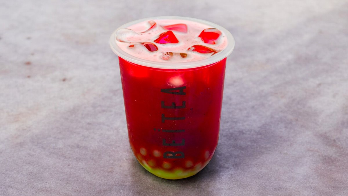 Strawberry jasmine milk tea, enhanced with cream and strawberry coulis, for an indulgent and rich experience