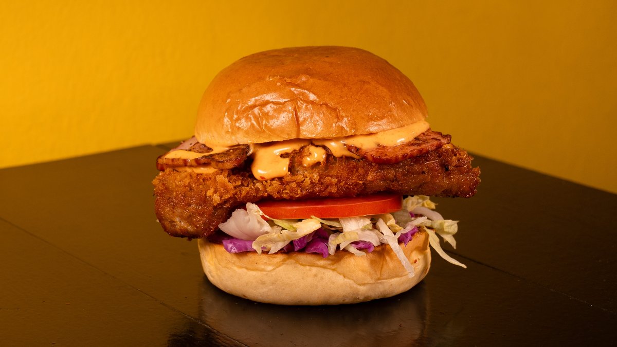Τραγανό κοτόπουλο, μπέικον, μαρούλι, ντομάτα, σπιτική πίκλα από λάχανο & σως Curry Mayo