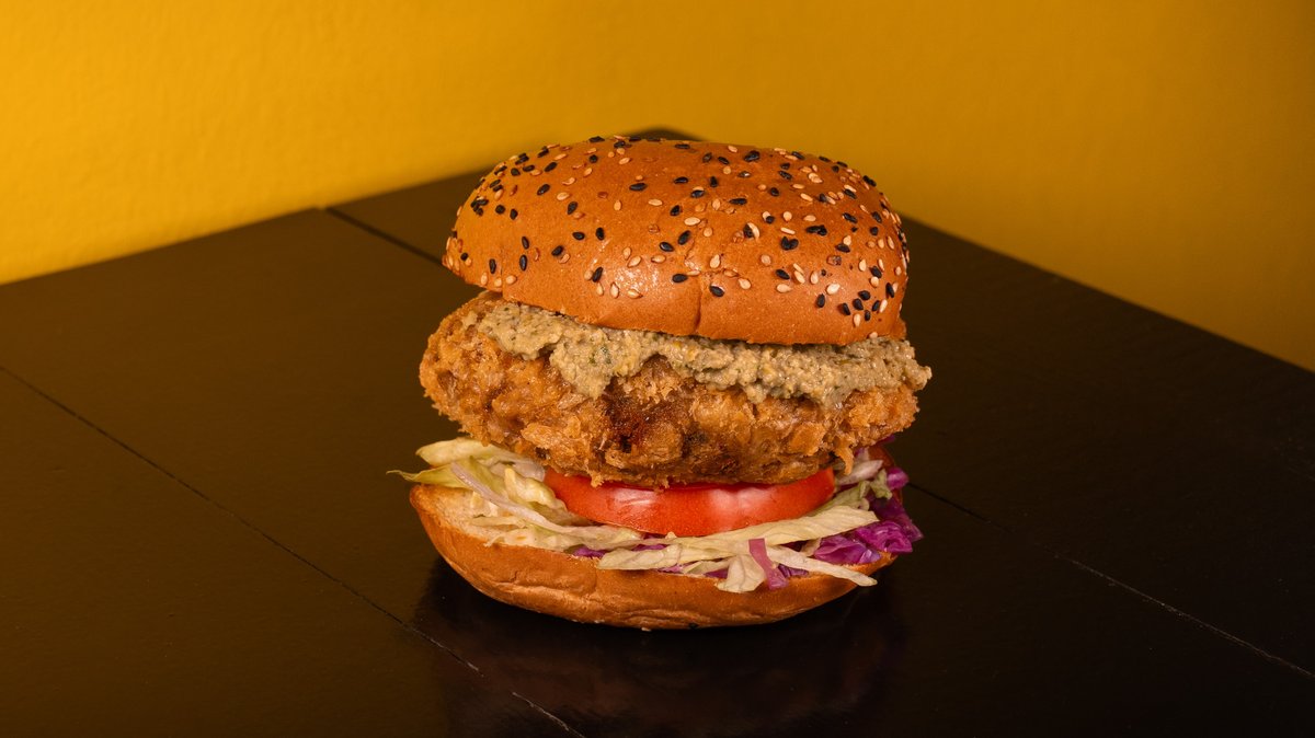 Χειροποίητο μπιφτέκι γλυκοπατάτας, μαρούλι, ντομάτα, σπιτική πίκλα από λάχανο & σως ενταμάμε με χούμους.