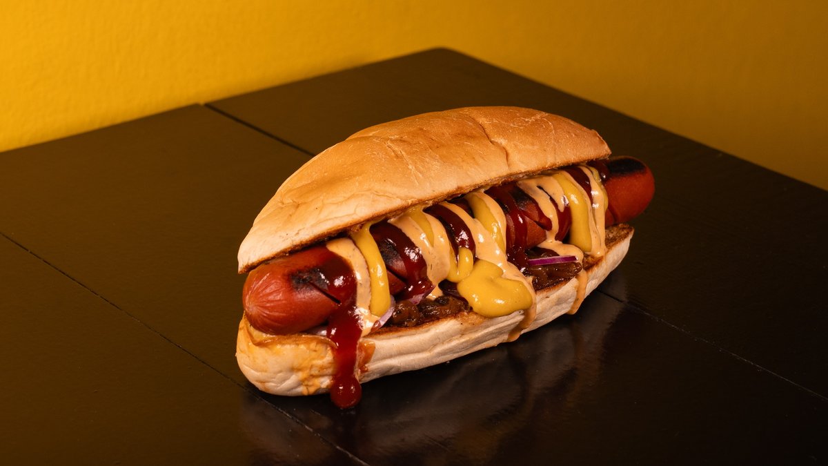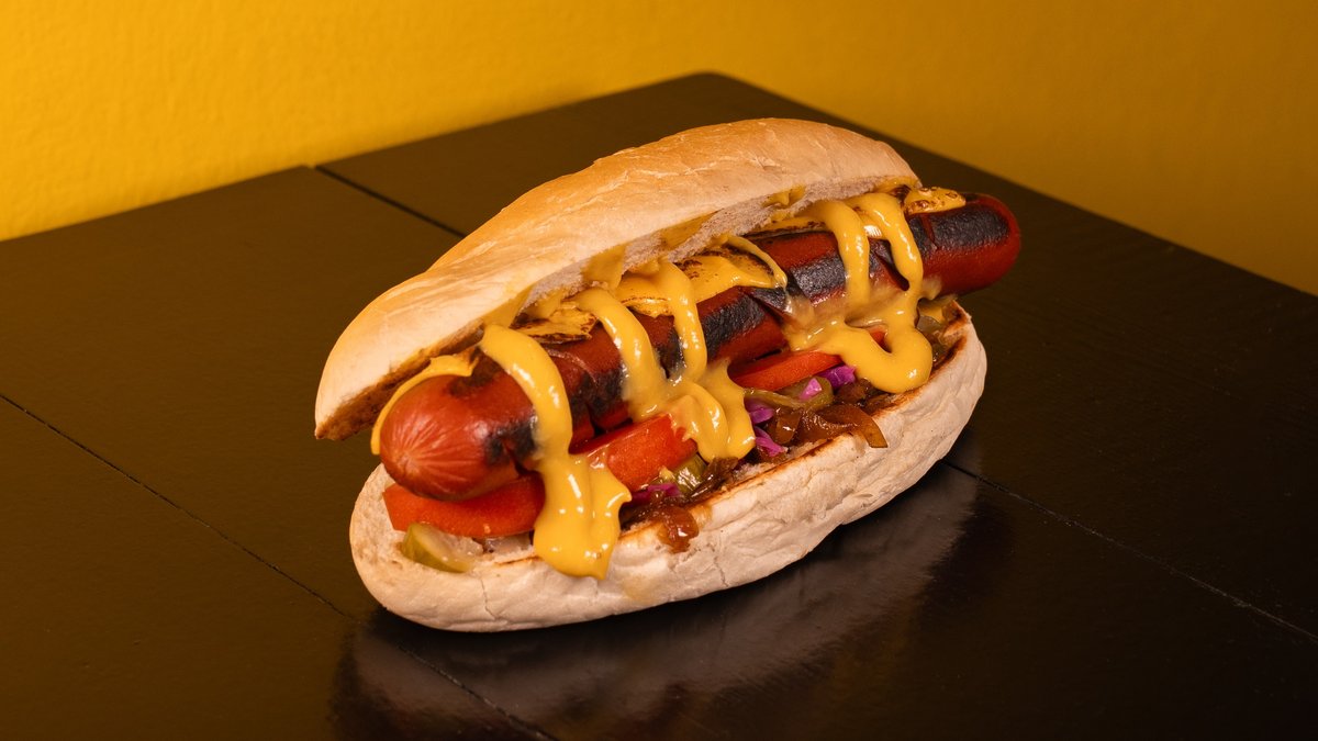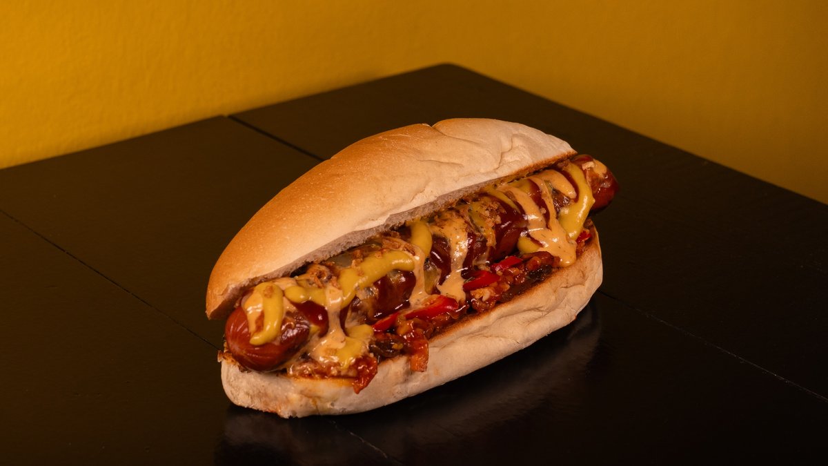 Λουκάνικο Pylsur, ντομάτα, καραμελωμένα κρεμμύδια, πικάντικη μουστάρδα, τουρσί αγγουράκι, σπιτική πίκλα από λάχανο, τυρί cheddar, νιφάδες κρεμμυδιού