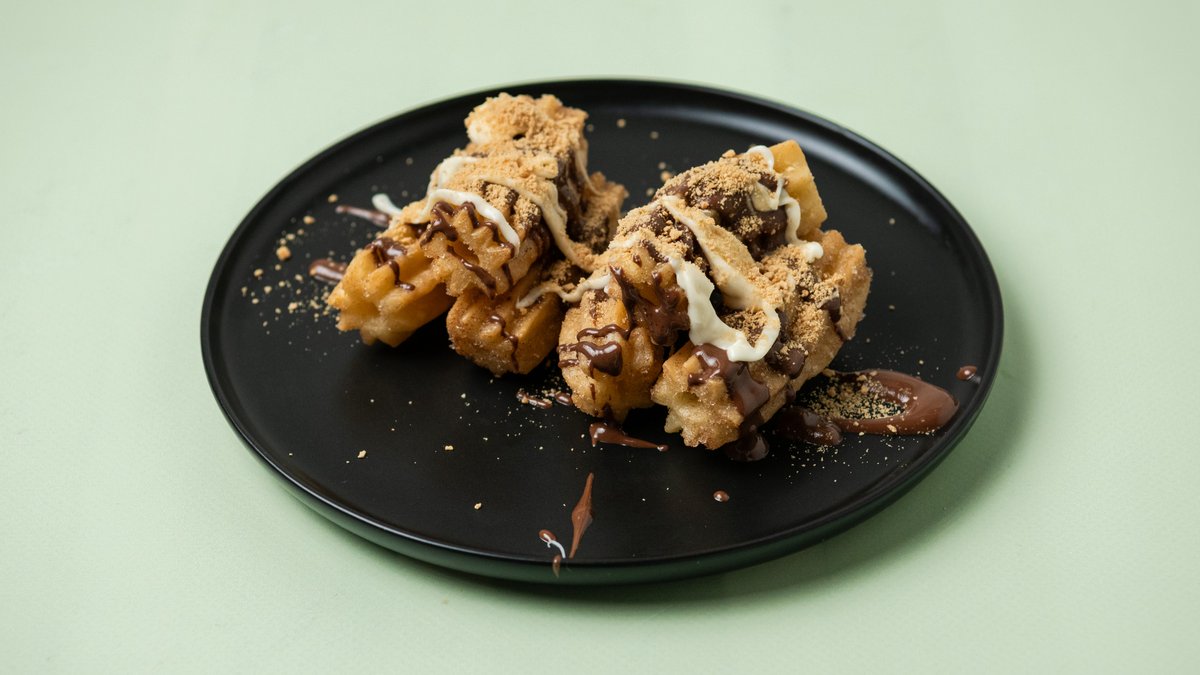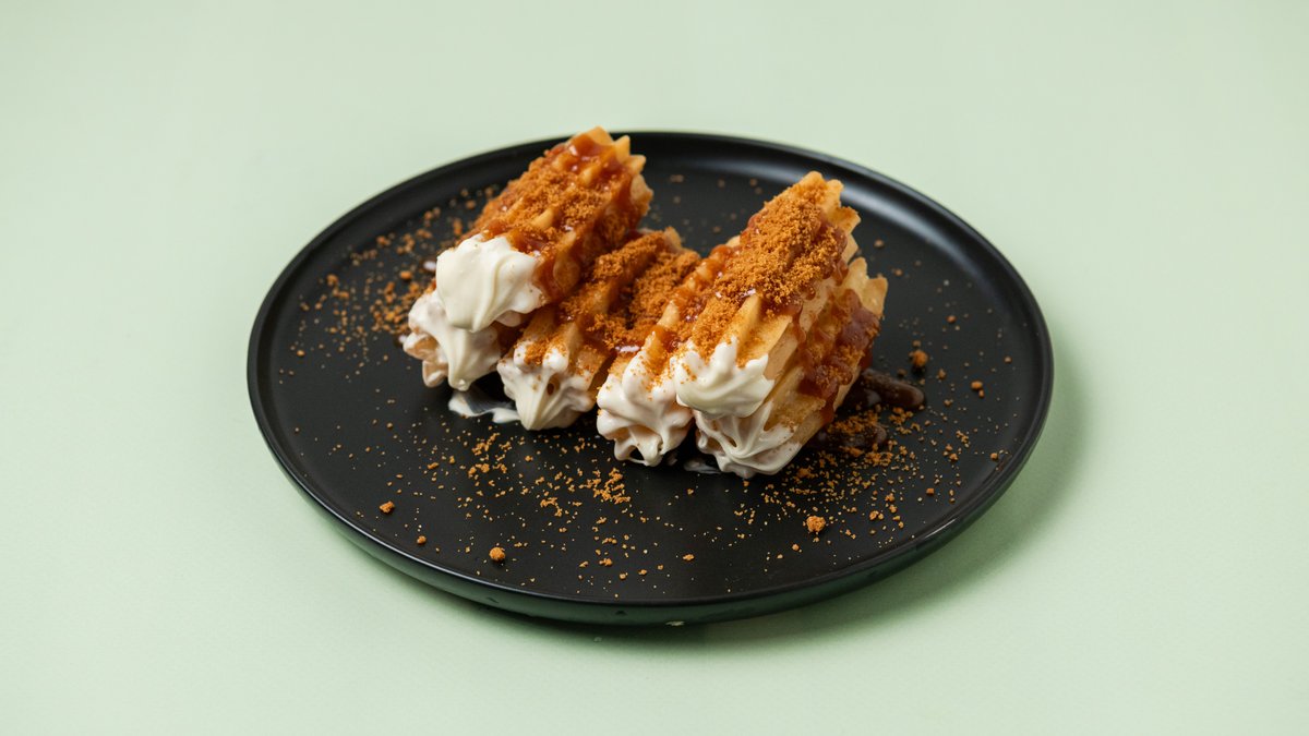 Churros or Churritos with white chocolate filling, toffee caramel topping and lotus biscuit