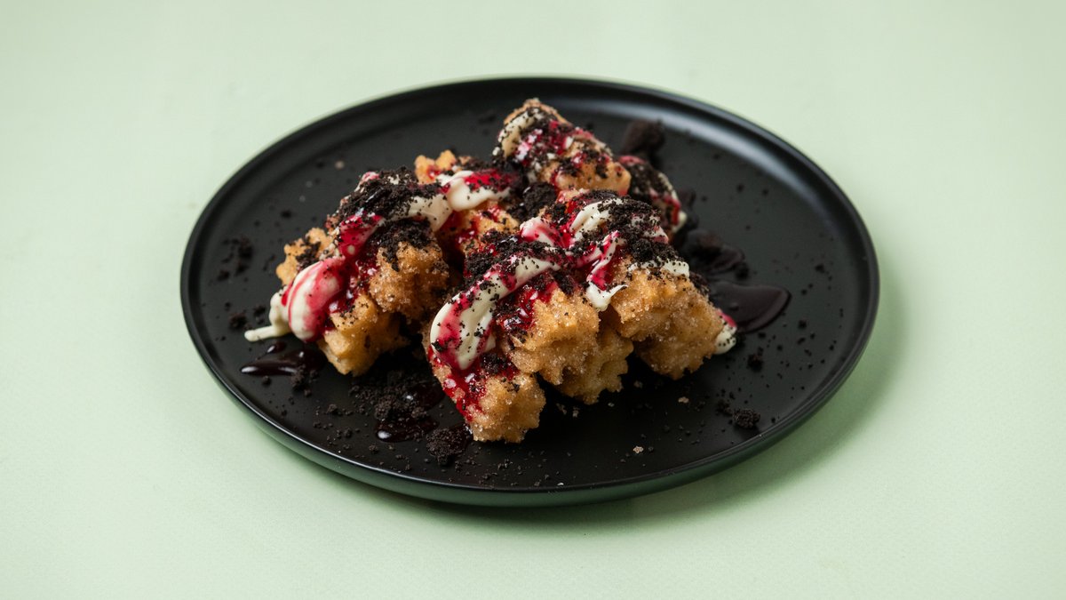 Churros or Churritos with white choco, oreo cookie and strawberry syrup