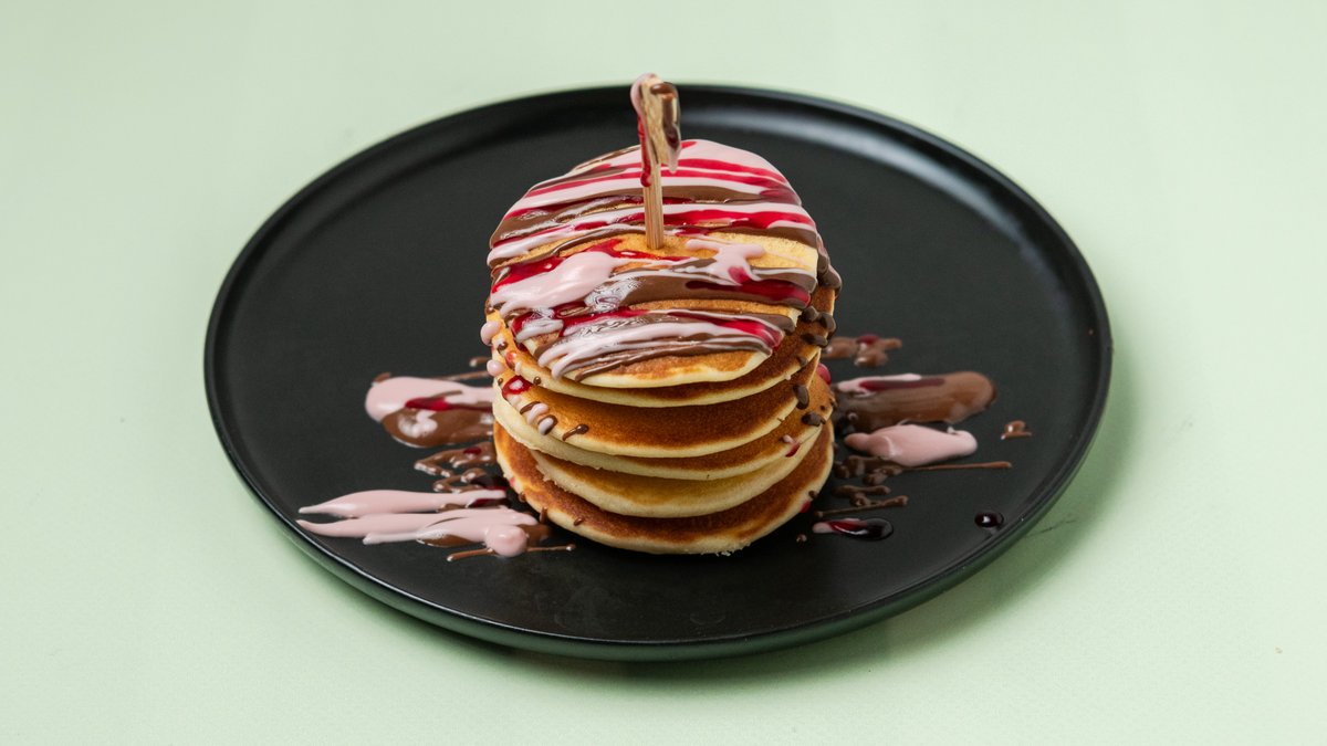 Mini pancakes with praline, strawberry choco and strawberry syrup