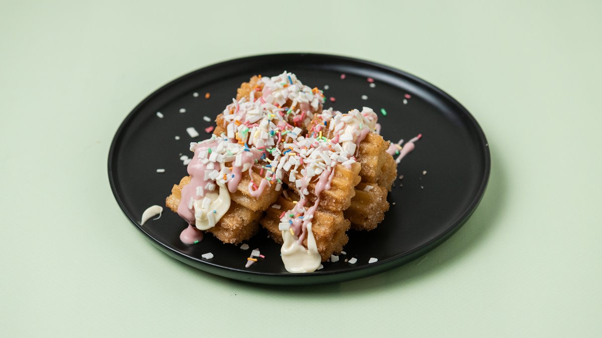 Churros or Churritos with strawberry choco, white choco, white chips and sprinkles