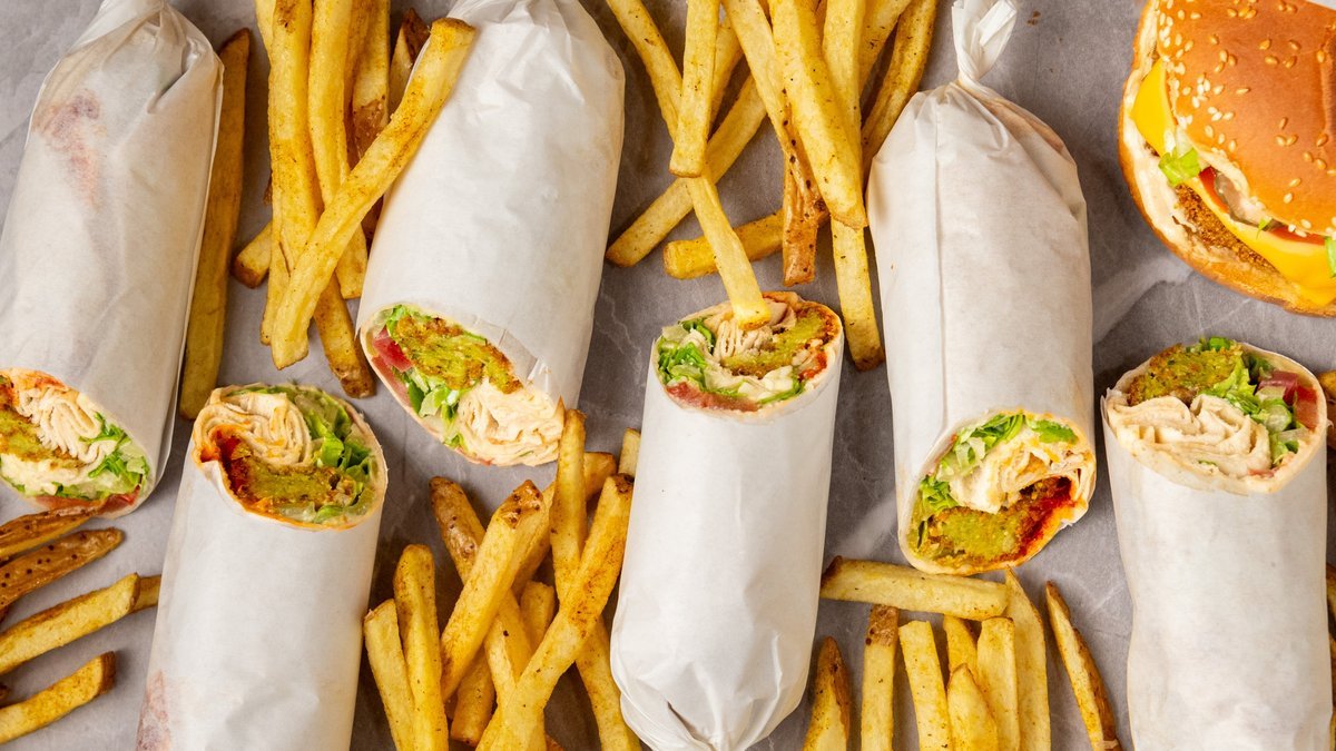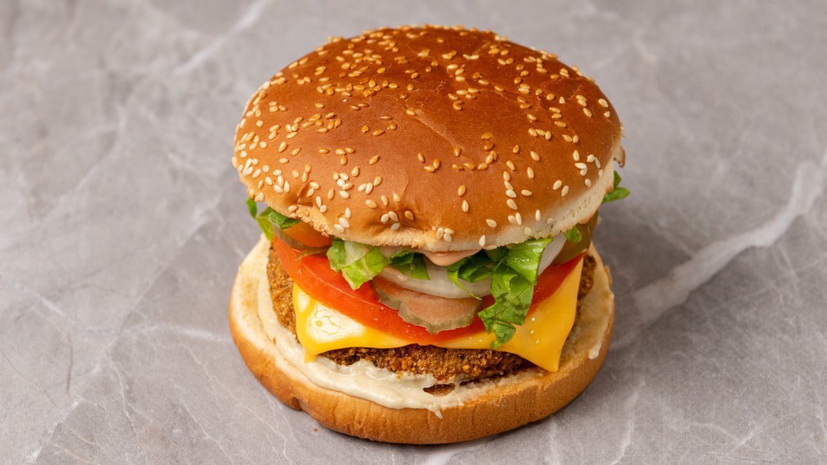 Mum's falafel, burger bread, cheese, lettuce, tomato, onion, cucumber pickles, cocktail sauce