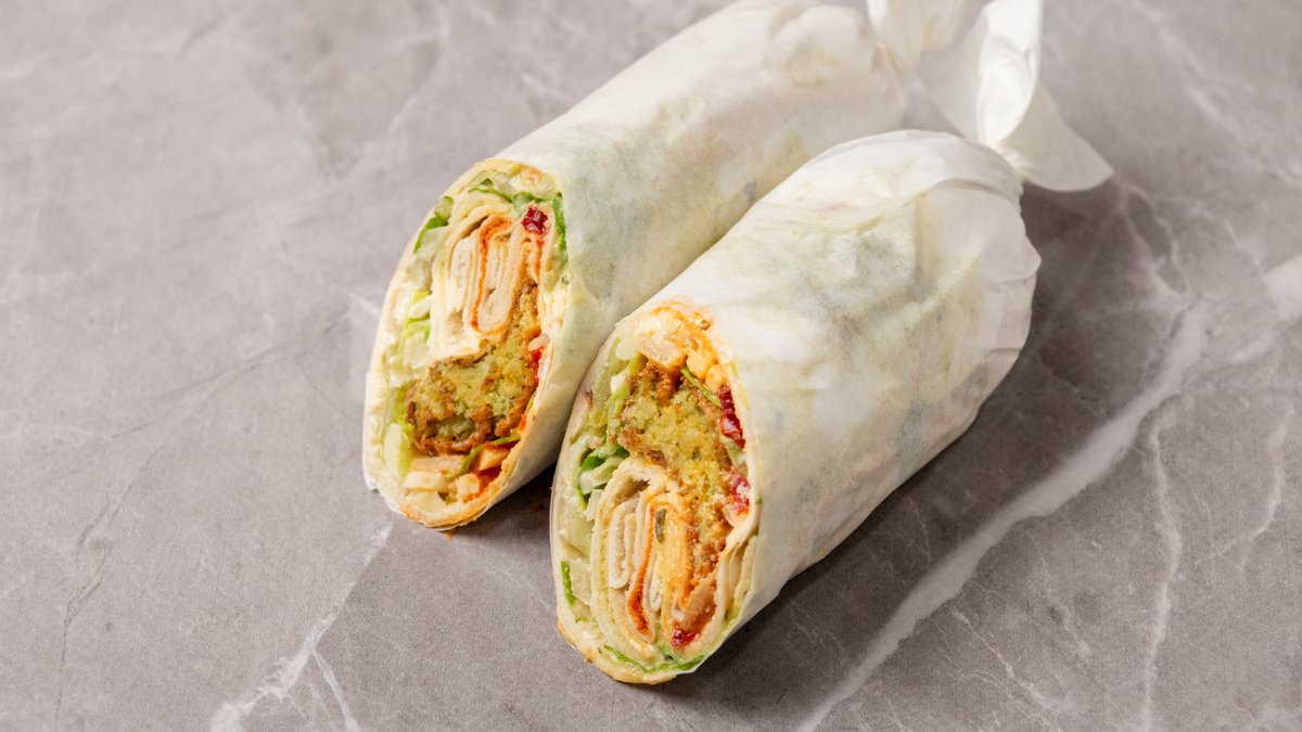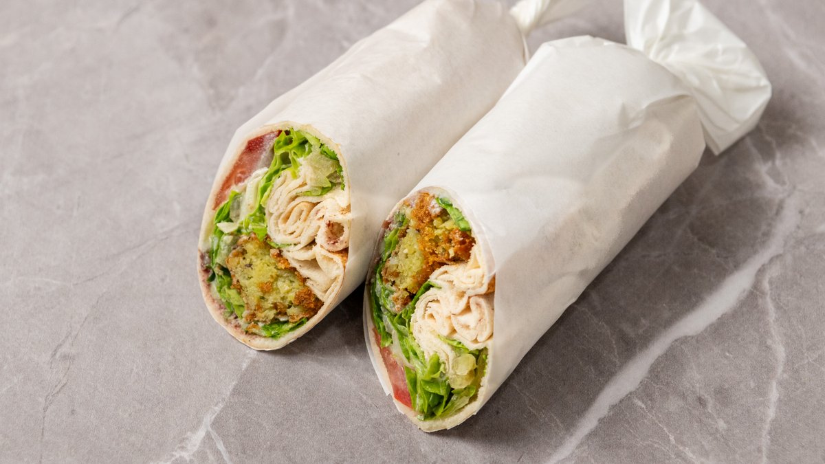 Mum's falafel, arabic bread, mozzarella cheese, tomato, lettuce, cumin, pesto mayo