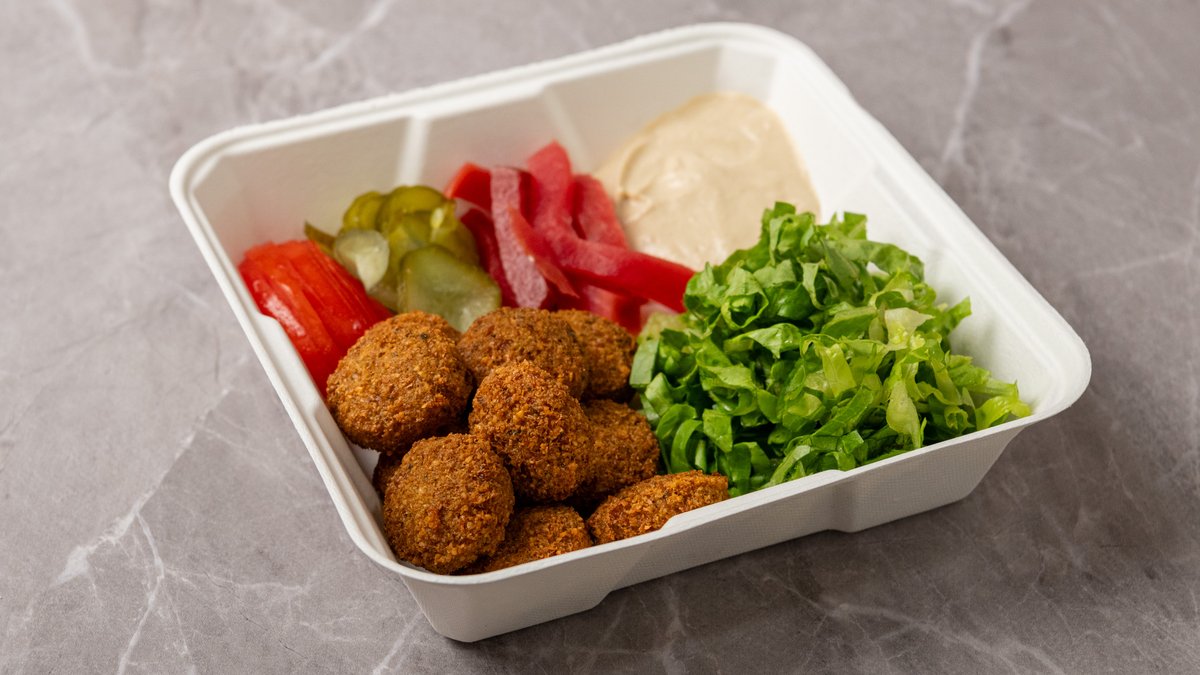 10 falafel pieces with vegetables, pickles, hummus dip and 1 pita breads