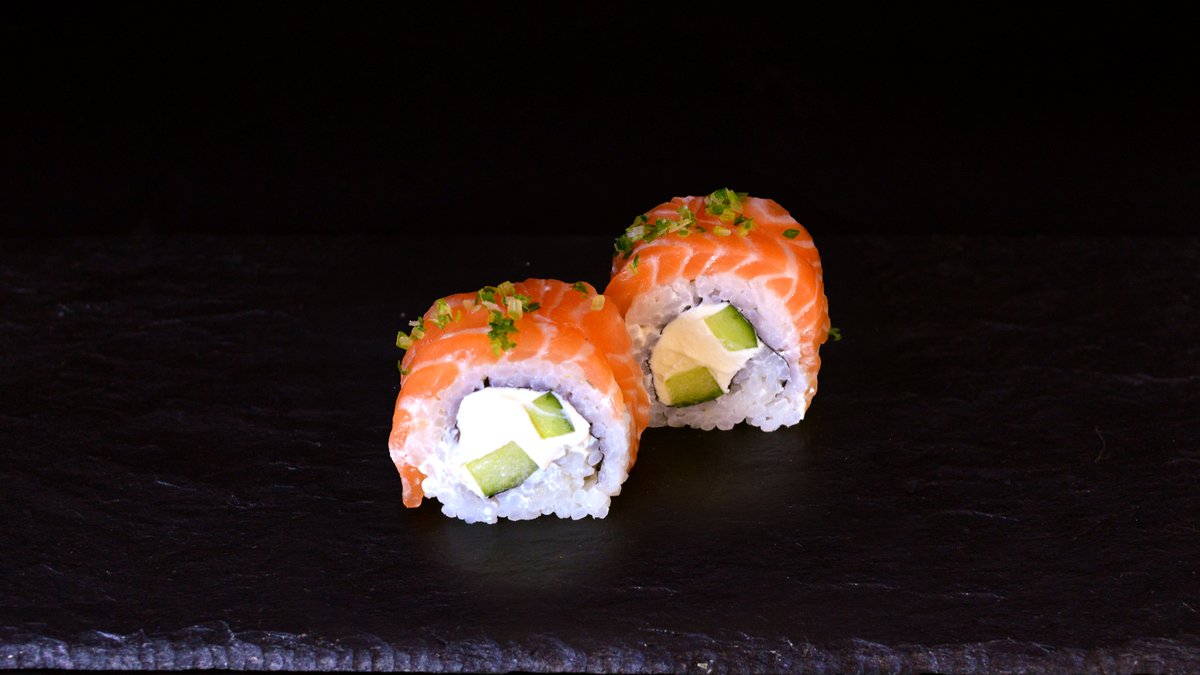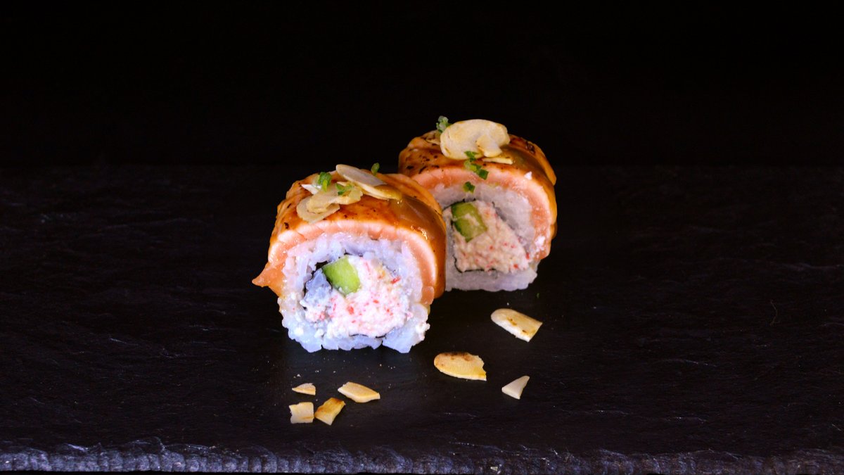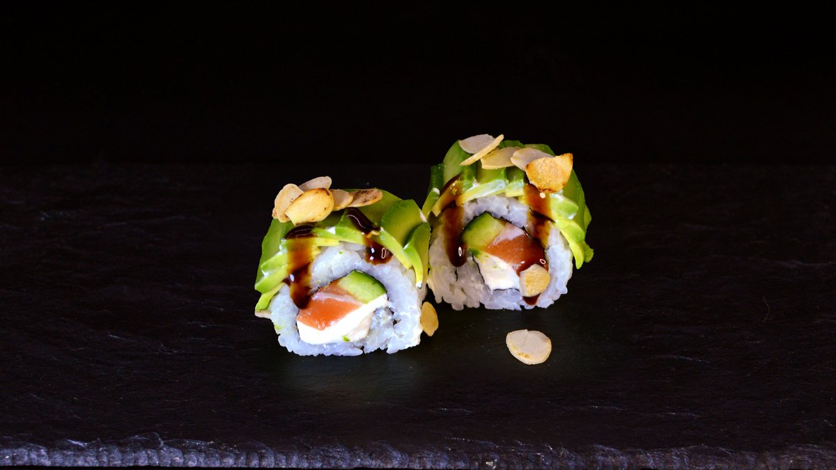 Salmon, cucumber, Philadelphia cheese, avocado, teriyaki sauce, almond flakes.