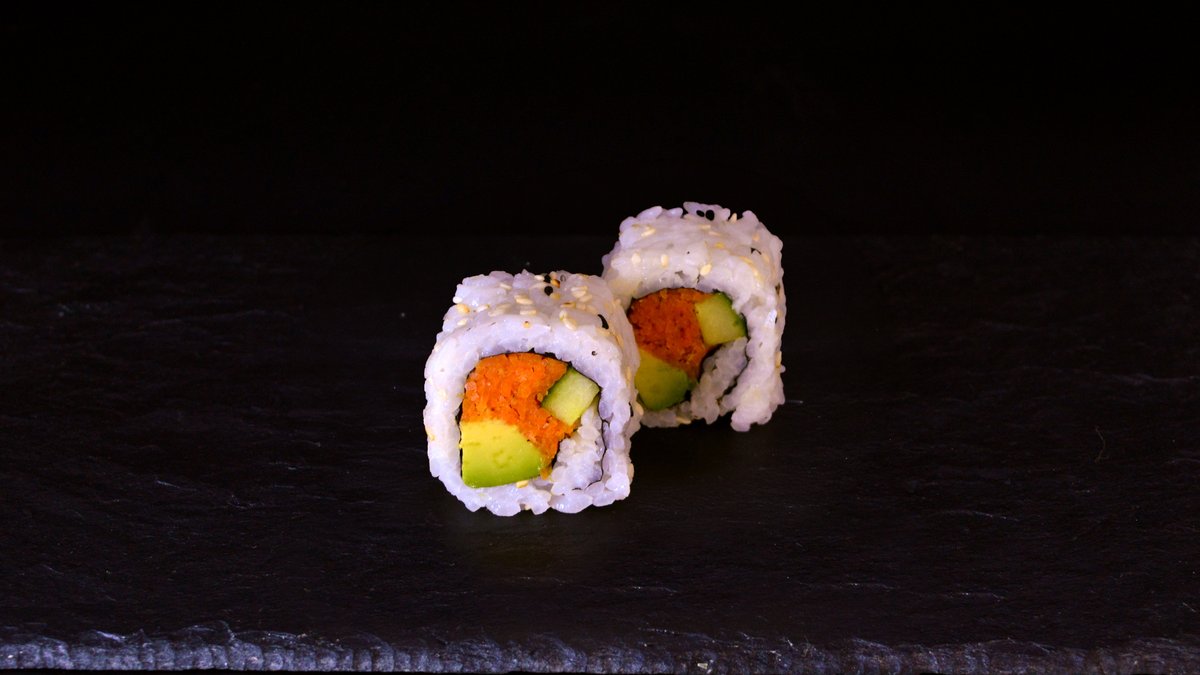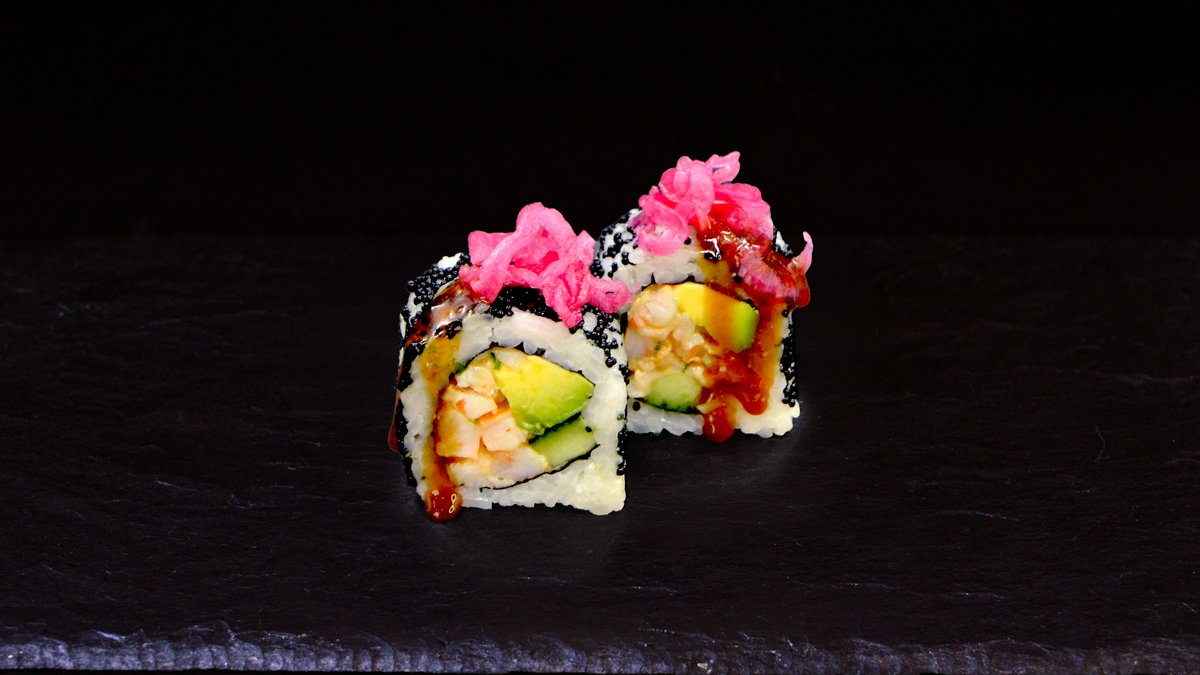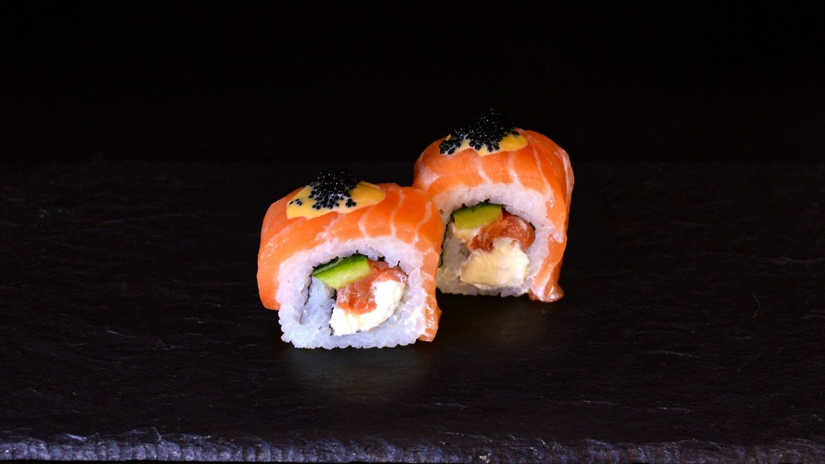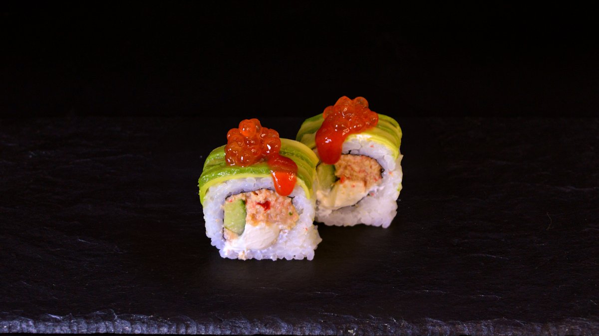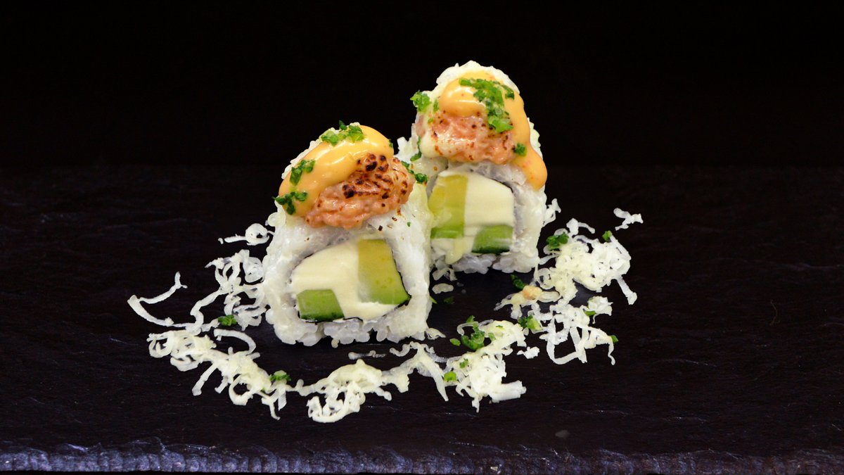 Spicy prawn mixture, Philadelphia cheese, salmon caviar, cucumber, avocado, sriracha sauce