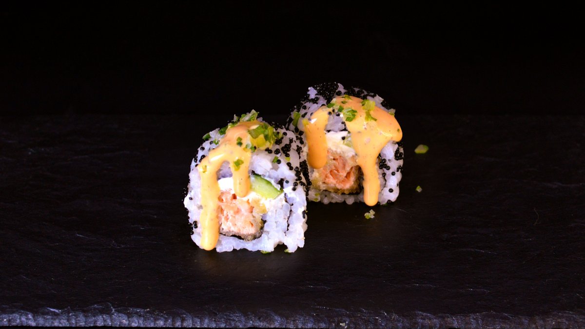 Marinated salmon tempura, Philadelphia cheese, cucumber, chives, tobiko caviar, spicy mayo