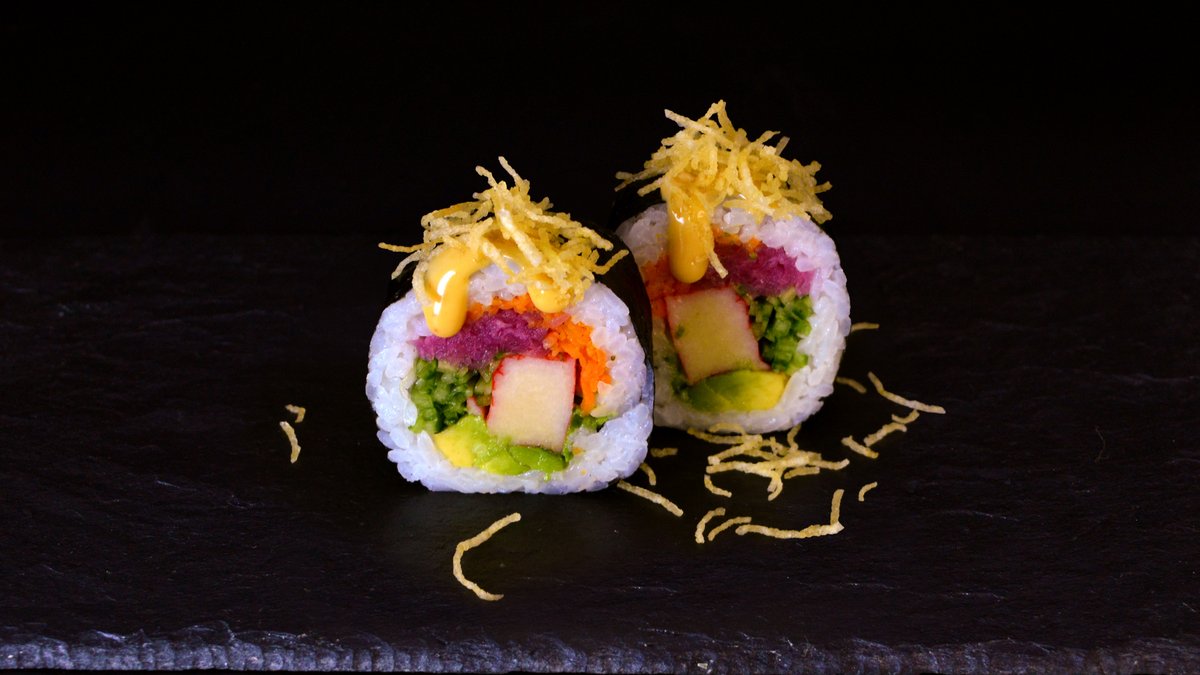Tempura zucchini, avocado, cucumber, marinated carrot, sweet chili mayo, chives