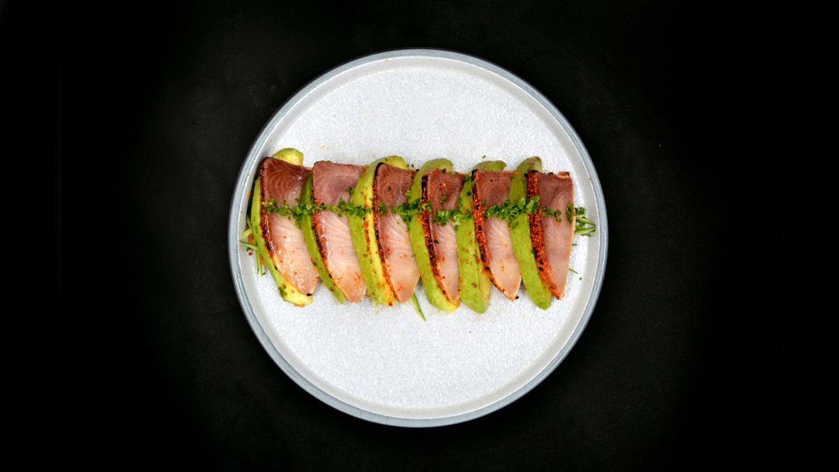 Torched hamachi, cucumber, carrot salad, togarashi spices, umami dressing, chives