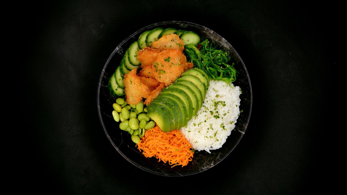 Rice, tempura prawns, cucumber, marinated carrot, avocado, edamame, wakame, sesame seeds, chives