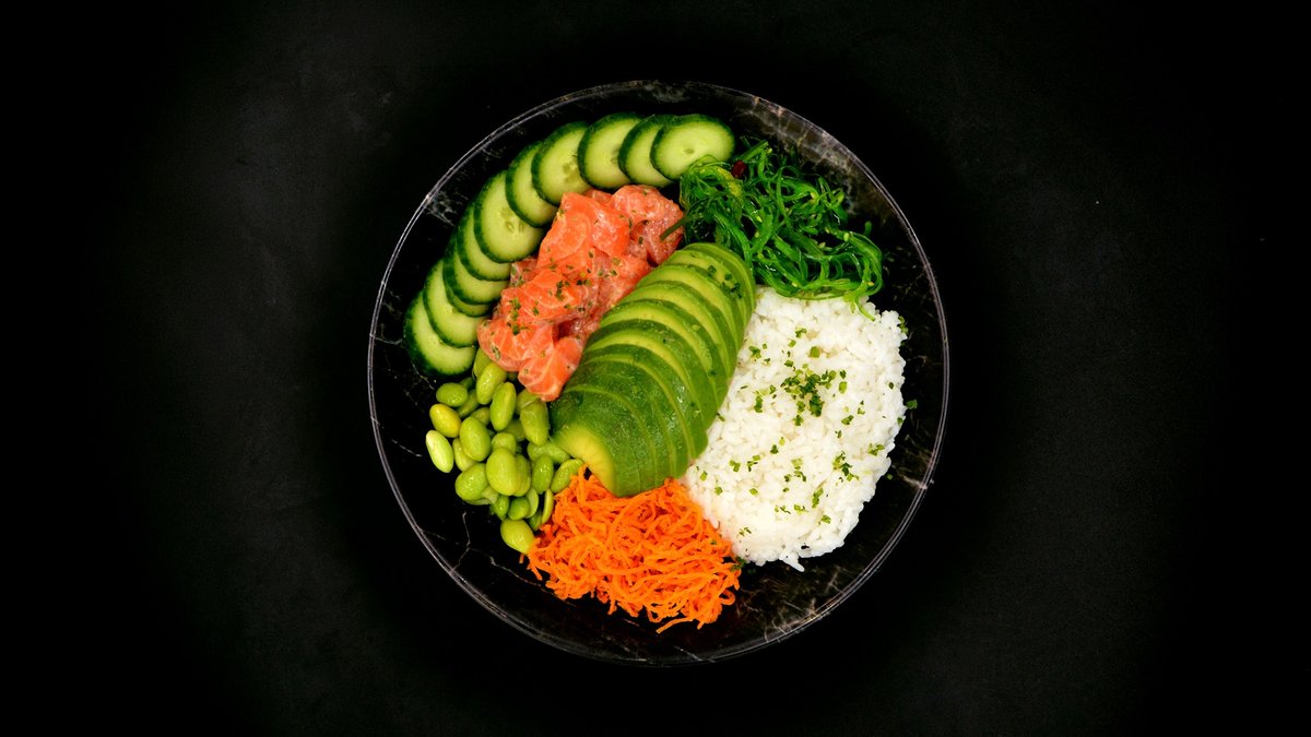 Rice, salmon, cucumber, marinated carrot, avocado, edamame, wakame, sesame seeds, chives