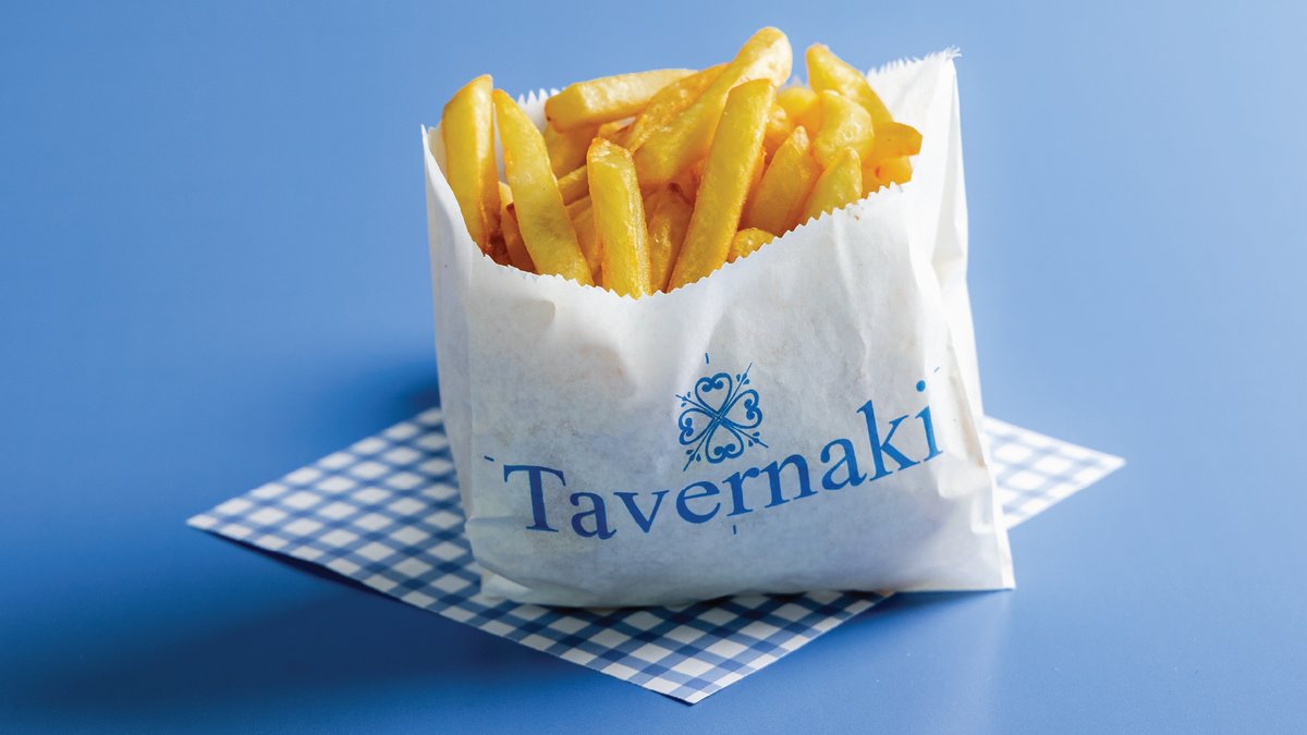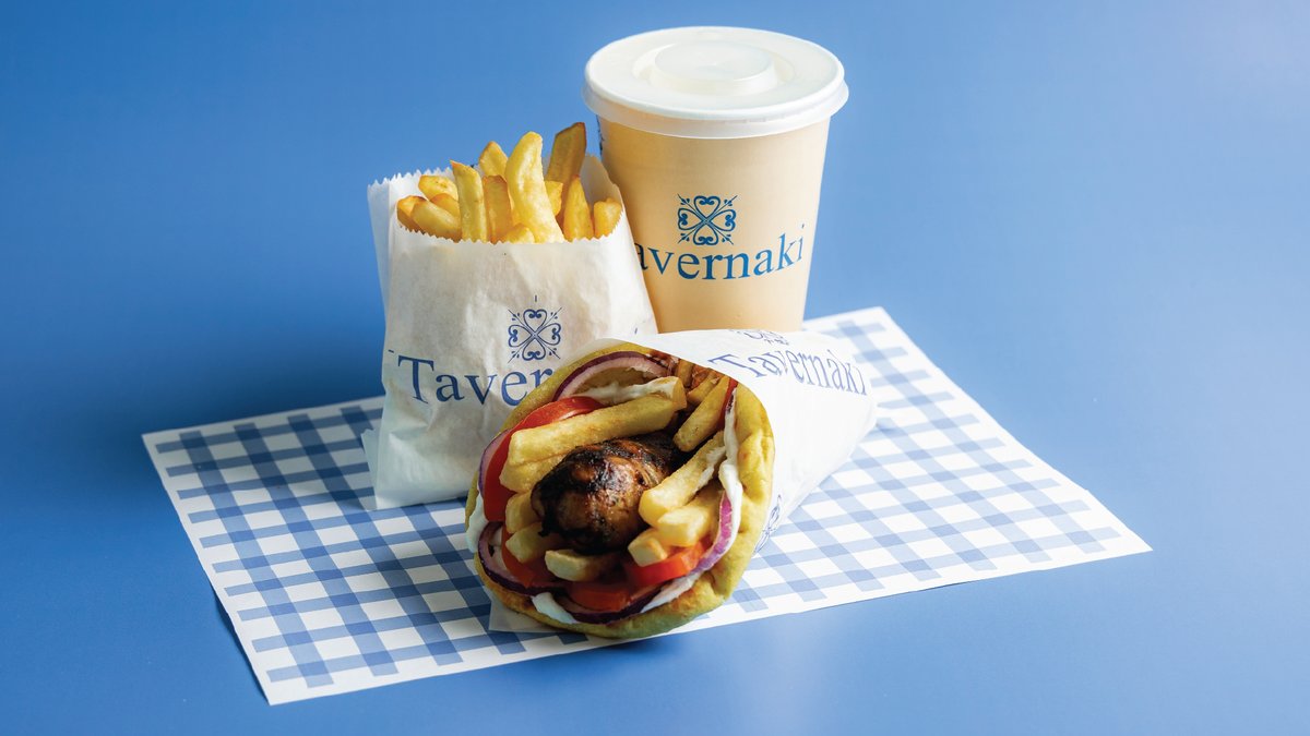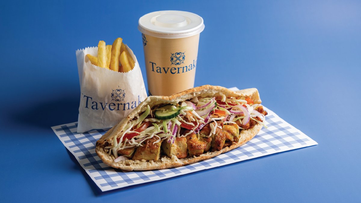 A skewer of Chicken Souvlaki, half Cyprus pita, tomato, cucumber, regular French fries and juice (250ml) or water (500ml)
