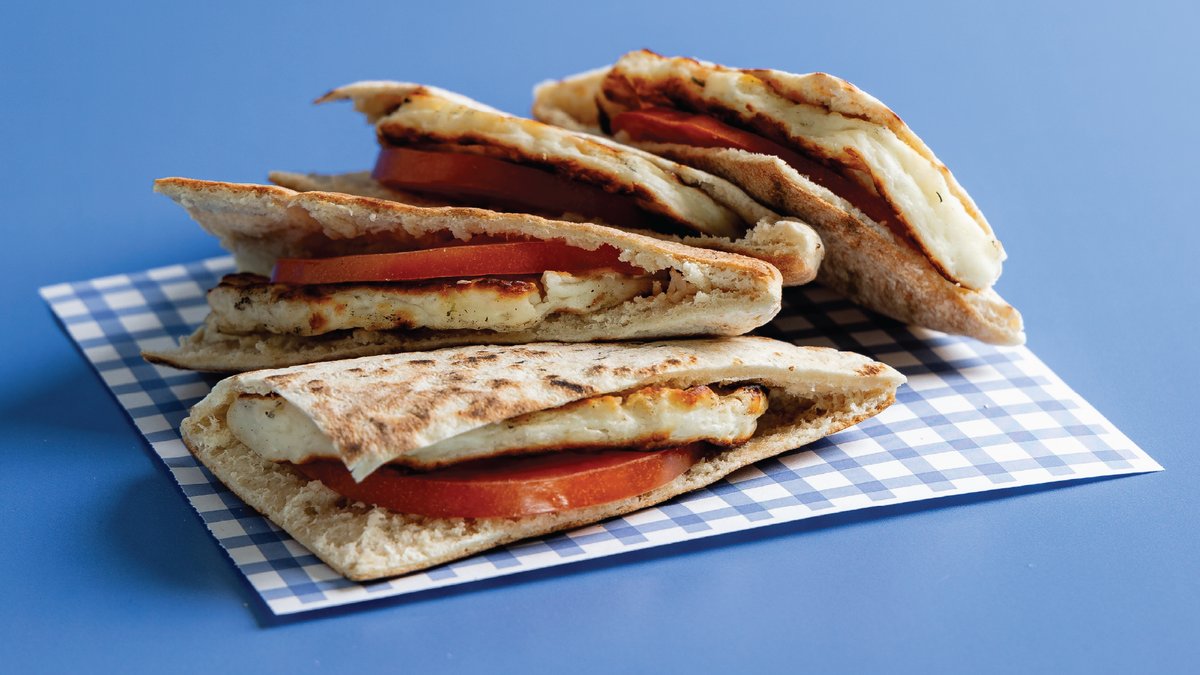 Four pieces grilled halloumi with sliced tomatoes in a Cyprus pita